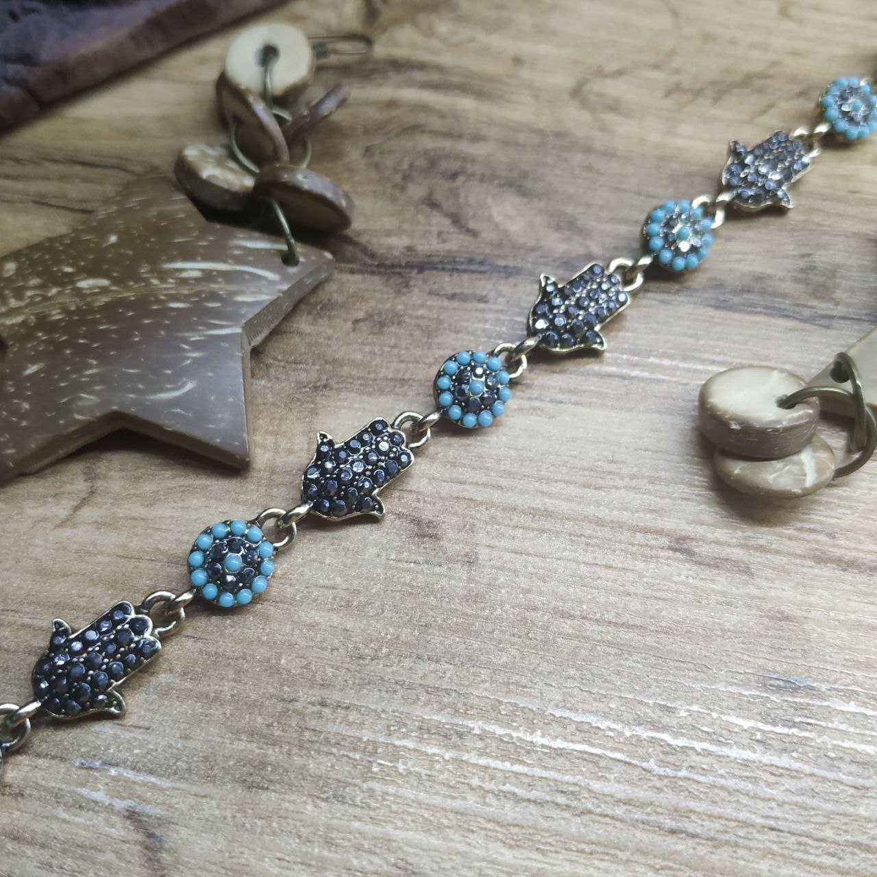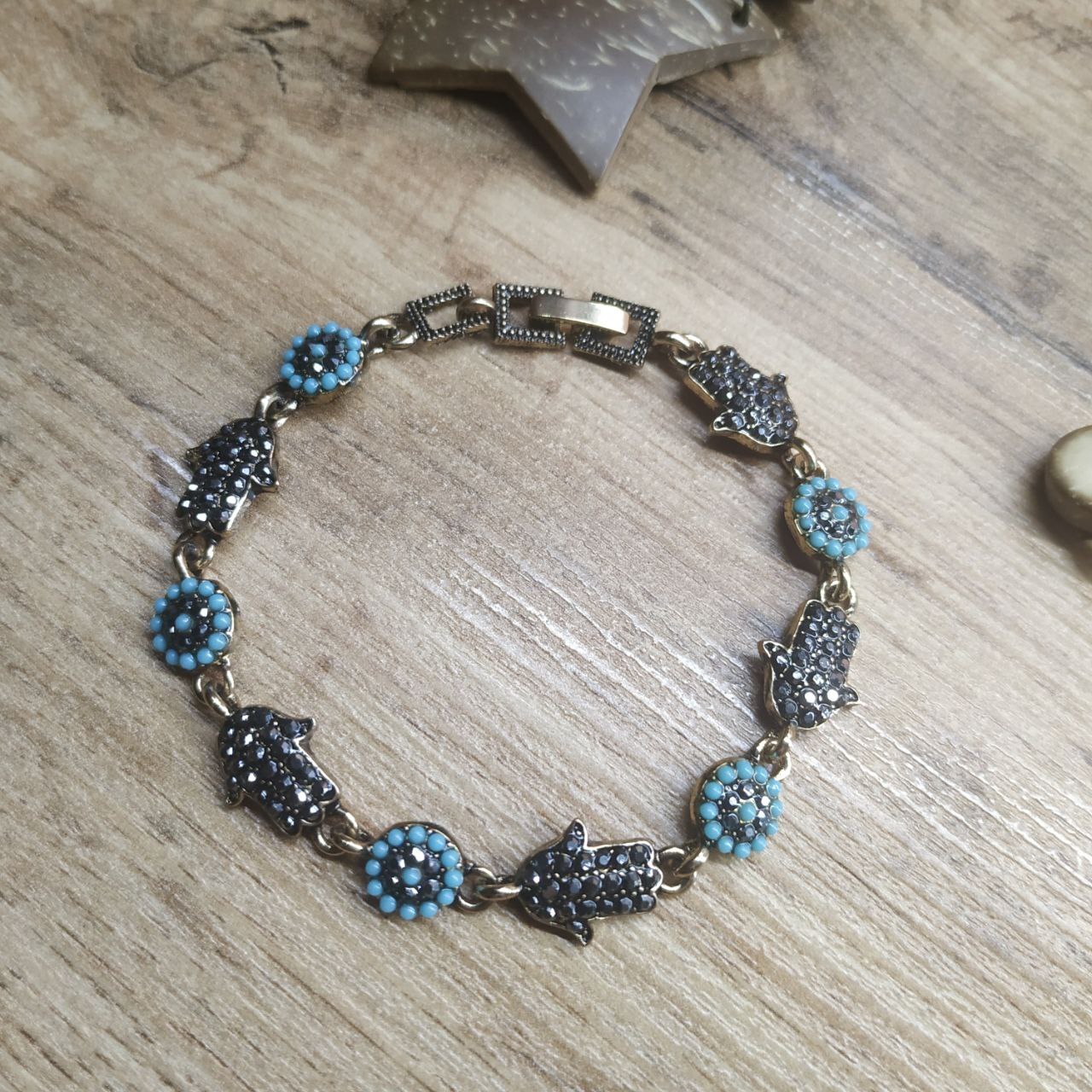 Браслет Vogue Хамса круг стразы графитовые бусинки голубые металл золотистый на красном бархате