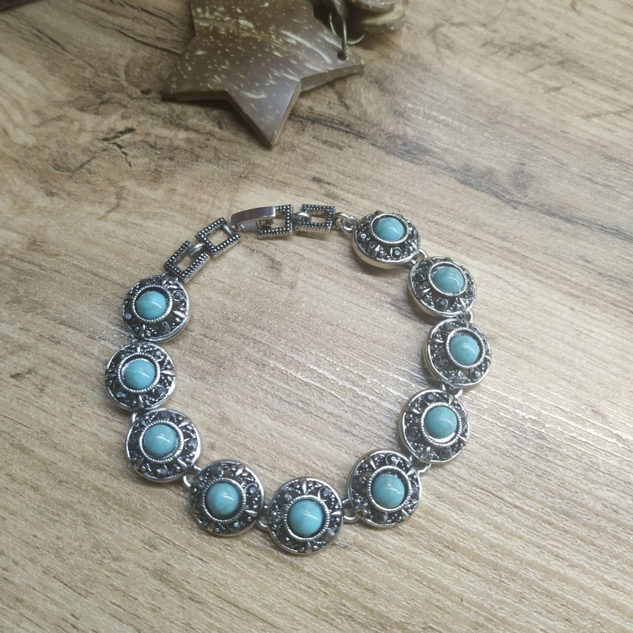 Браслет Vogue Круг бусина под бирюзу стразы графитовые металл серебристый на красном бархате