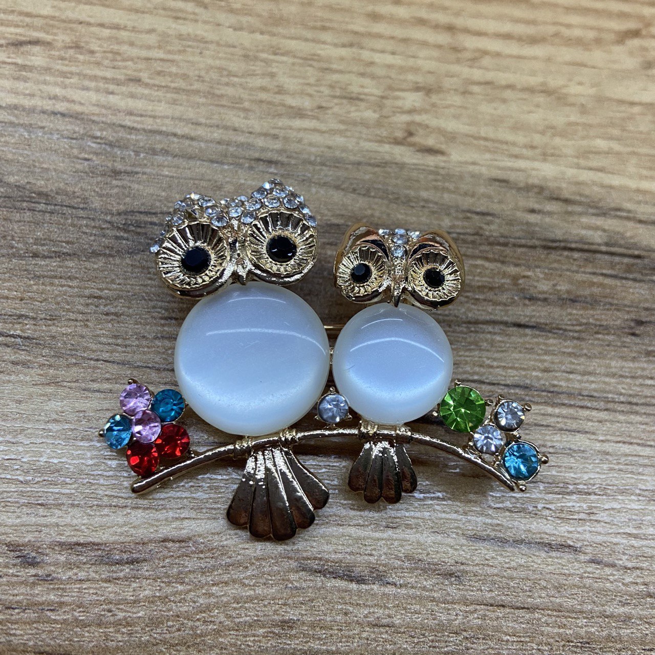 Брошь 2 совы кабошон кошачий глаз стразы цвет микс металл золотистый