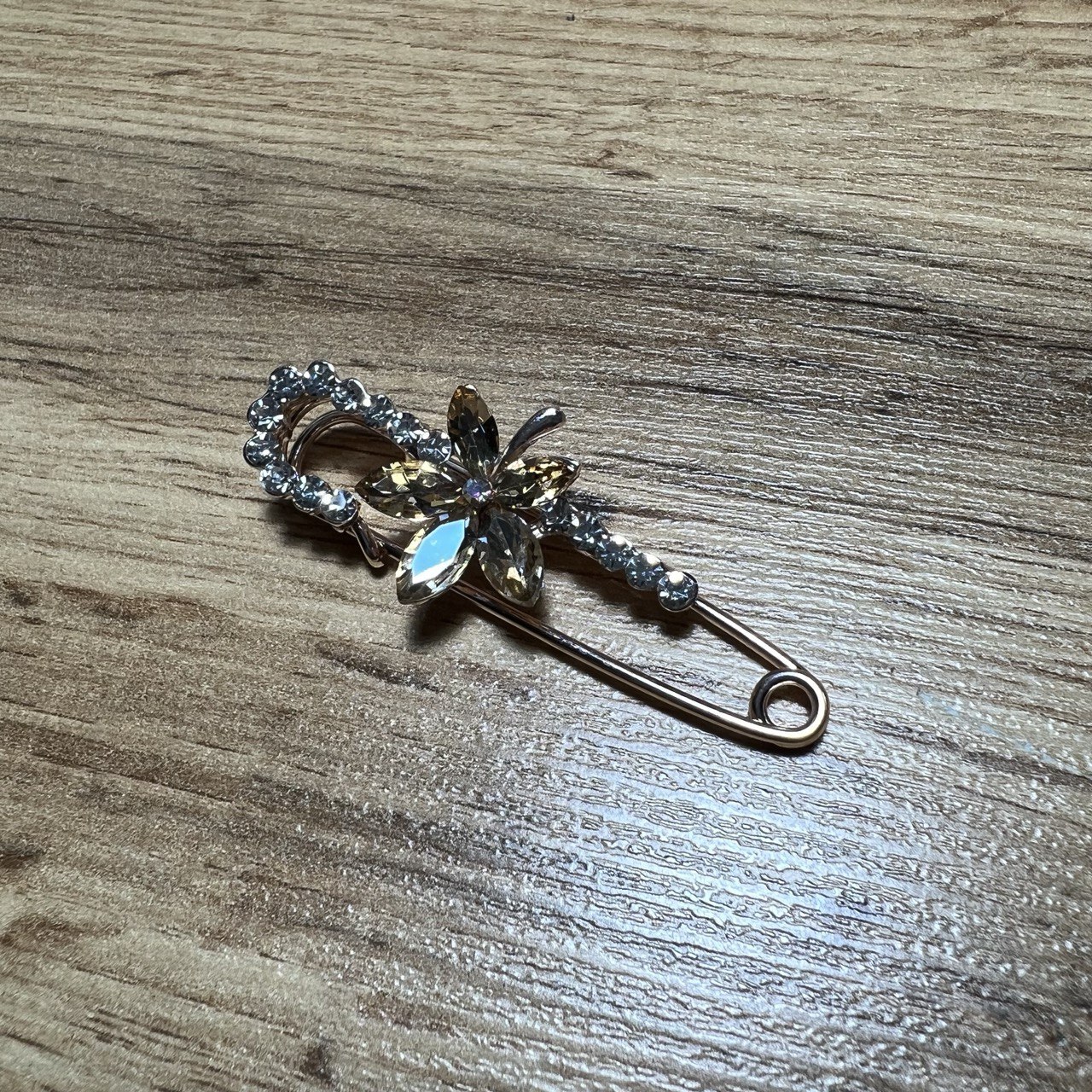 Брошь-булавка Цветочек пятилистник со стеблем кристалл бежевый стразы металл золотистый 5,5 см