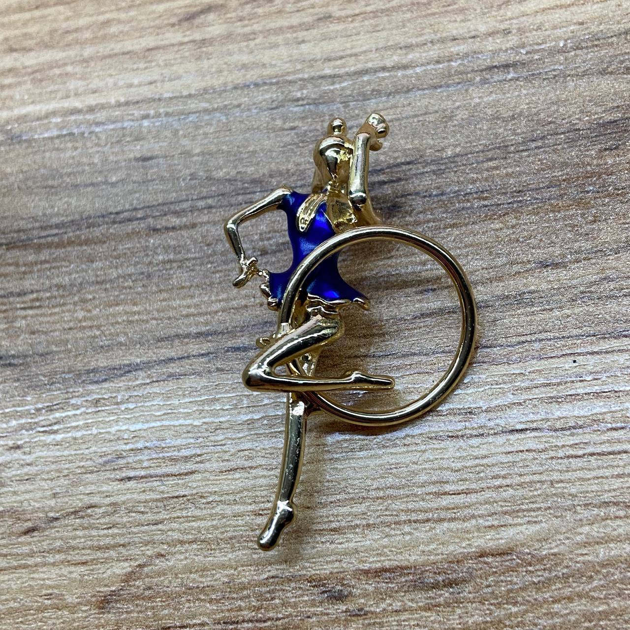 Брошь Гимнастка с обручем на ноге платье синее металл золотистый