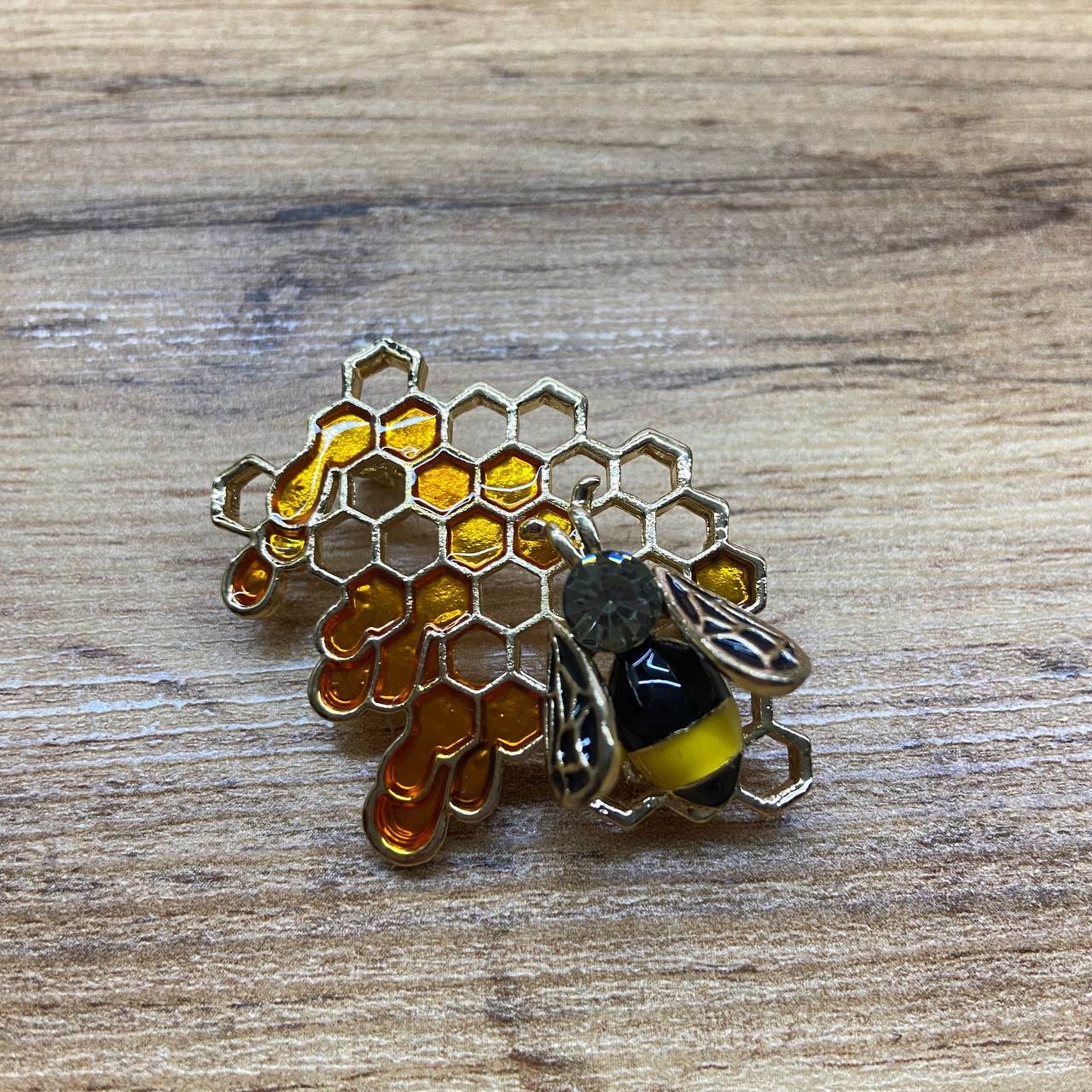 Брошь Пчела на сотах эмаль цветная кристалл металл золотистый