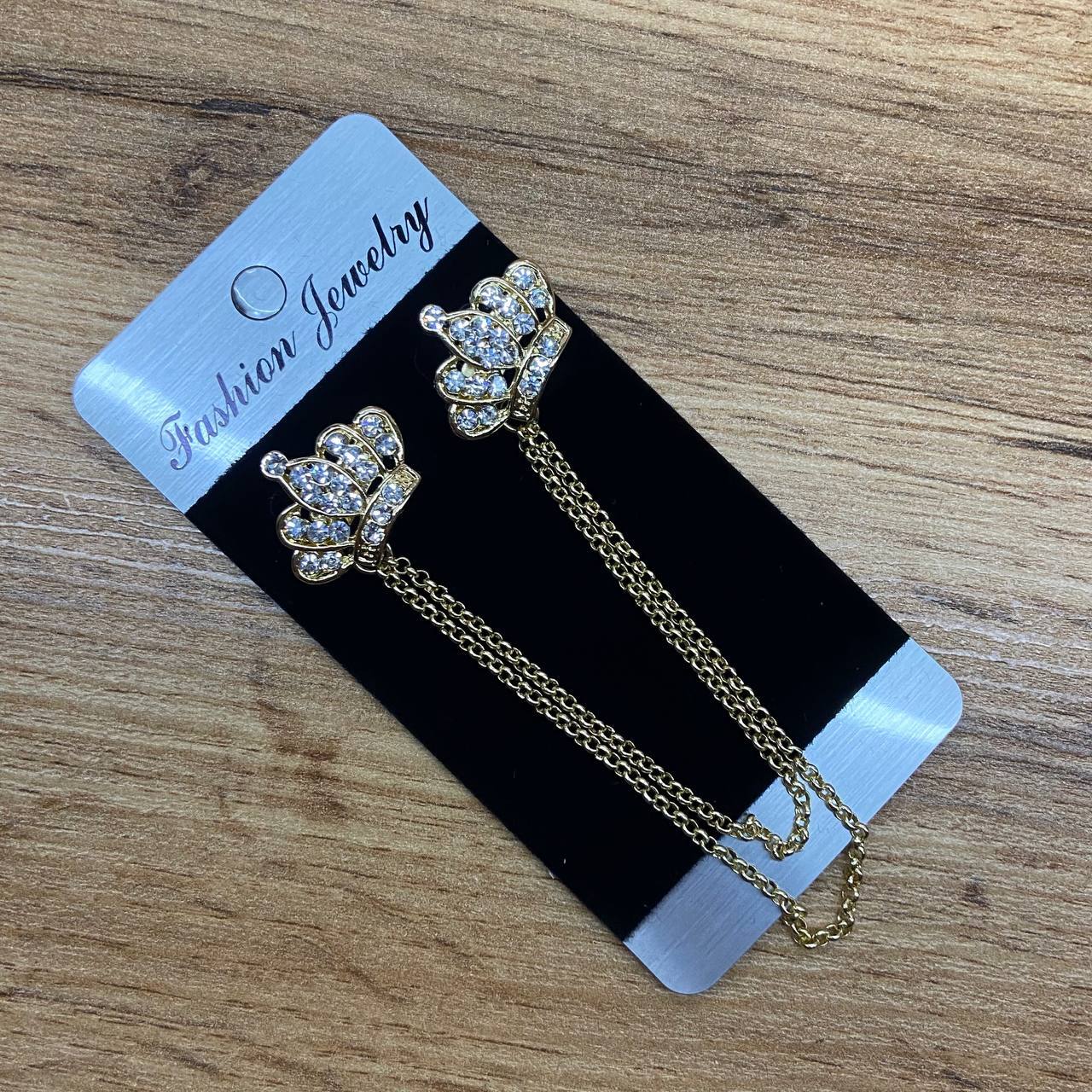 Брошь-шатлен на воротничок с цепочками Корона стразы металл золотистый