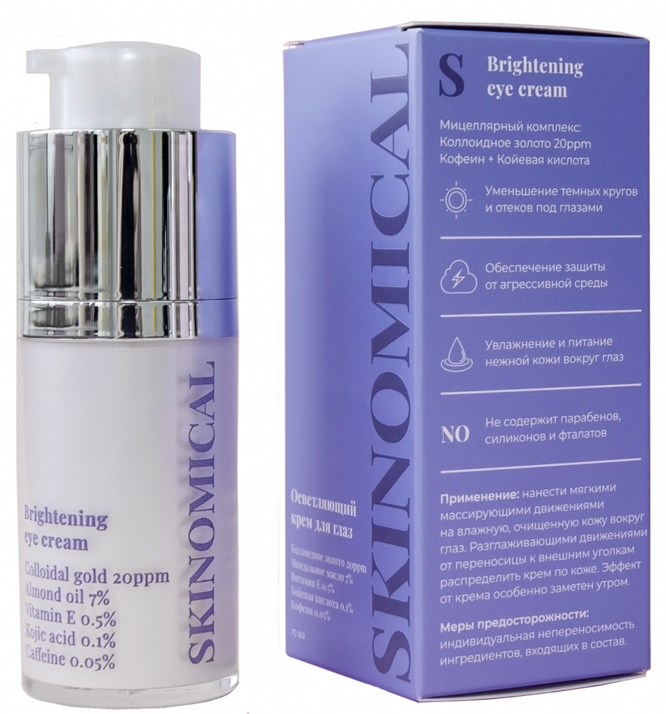 Осветляющий крем для глаз Skinomical Brightening Eye Cream, 15 мл Крем для глаз SKINOMICAL помогает уменьшить пигментацию нежной кожи вокруг глаз и способствует снятию отеков. Благодаря большому количеству миндального масла, крем препятствует испарению влаги и создает защитную пленку на поверхности кожи. Мицеллярный комплекс, состоящий из коллоидного золота и кофеина, способствует оттоку жидкости из глубоких слоев кожи, обладает легким лифтинг-эффектом. Койевая кислота блокирует выработку пигмента меланина, осветляя кожу, придает глазам свежий отдохнувший вид. Витамин Е питает кожу, укрепляет стенки сосудов и тонизирует. Благодаря уникальному составу, крем для кожи вокруг глаз SKINOMICAL выполняет следующие функции: уменьшение темных кругов и отеков под глазами, обеспечение защиты от агрессивной среды, увлажнение и питание нежной кожи вокруг глаз.