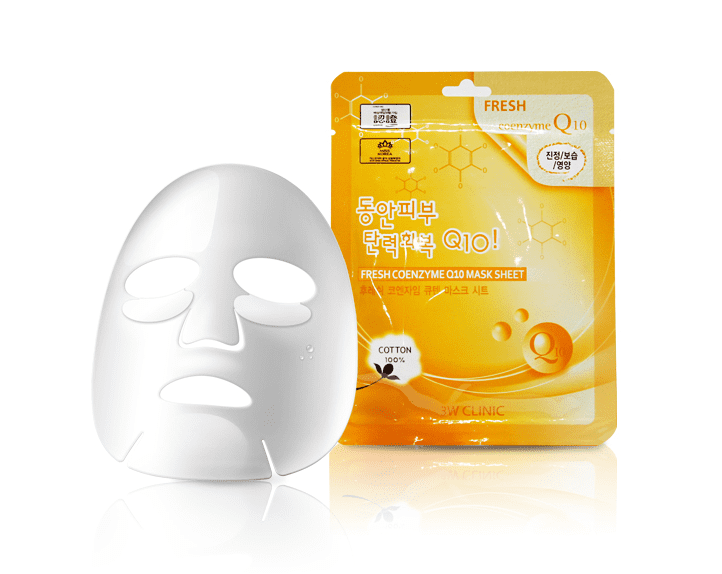 Тканевая маска для лица торговой марки 3W Clinic с коэнзимом Q10 Fresh Coenzyme Q10 Mask Sheet Коэнзим Q10 оказывает выраженное антиоксидантное действие, защищает клетки от воздействия свободных радикалов, способствует профилактике старения кожи, стимулирует снабжение клеток энергией, ускоряет их регенерации и синтез коллагена, предупреждает разрушение эластиновых волокон.