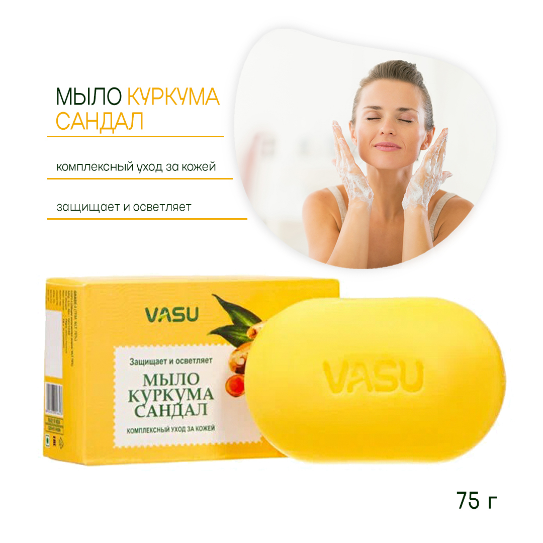 Мыло Vasu "Куркума и Сандал" представлено в упаковке весом 75 г, что обеспечивает длительное использование продукта.