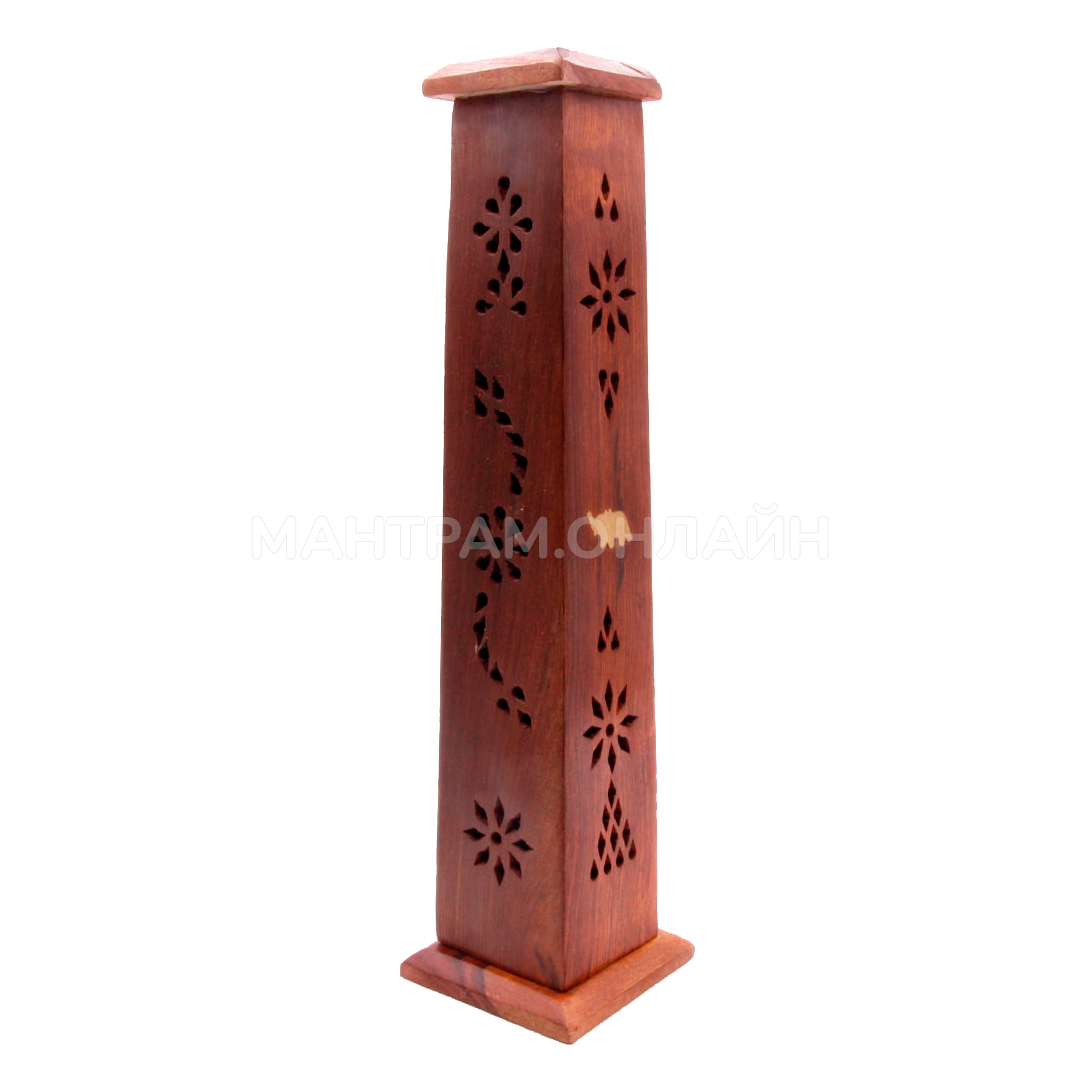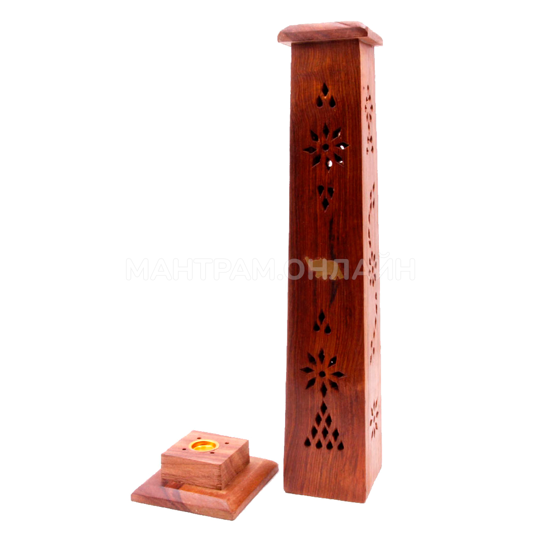Резная деревянная подставка для благовоний Башня со слоном. Сделана из дерева шишам в натуральной цветовой гамме. Хотите ощутить у себя дома европейский комфорт и восточный колорит? Тогда необычная индийская подставка для благовоний в форме башни - это то, что Вам нужно! Она предназначена для возжигания ароматических палочек на бамбуковой основе и ароматических конусов. Аромапалочки нужно поджечь, затем потушить пламя и тлеющую палочку поставить вертикально, для этого имеются четыре отверстия – можно смешивать разные запахи. Внутри подставки можно также возжигать аромаконусы. Затем тлеющие благовония следует накрыть резной крышкой подставки. Из прорезей заструится ароматный дым, что будет выглядеть очень эффектно. С помощью подставки для благовоний можно создать в доме собственную уютную атмосферу, которая будет позитивно влиять на настроение и жизнь, надо только выбрать правильную подставку и купить подходящие благовония. Все это в огромном ассортименте имеется в нашем магазине подарков и сувениров.