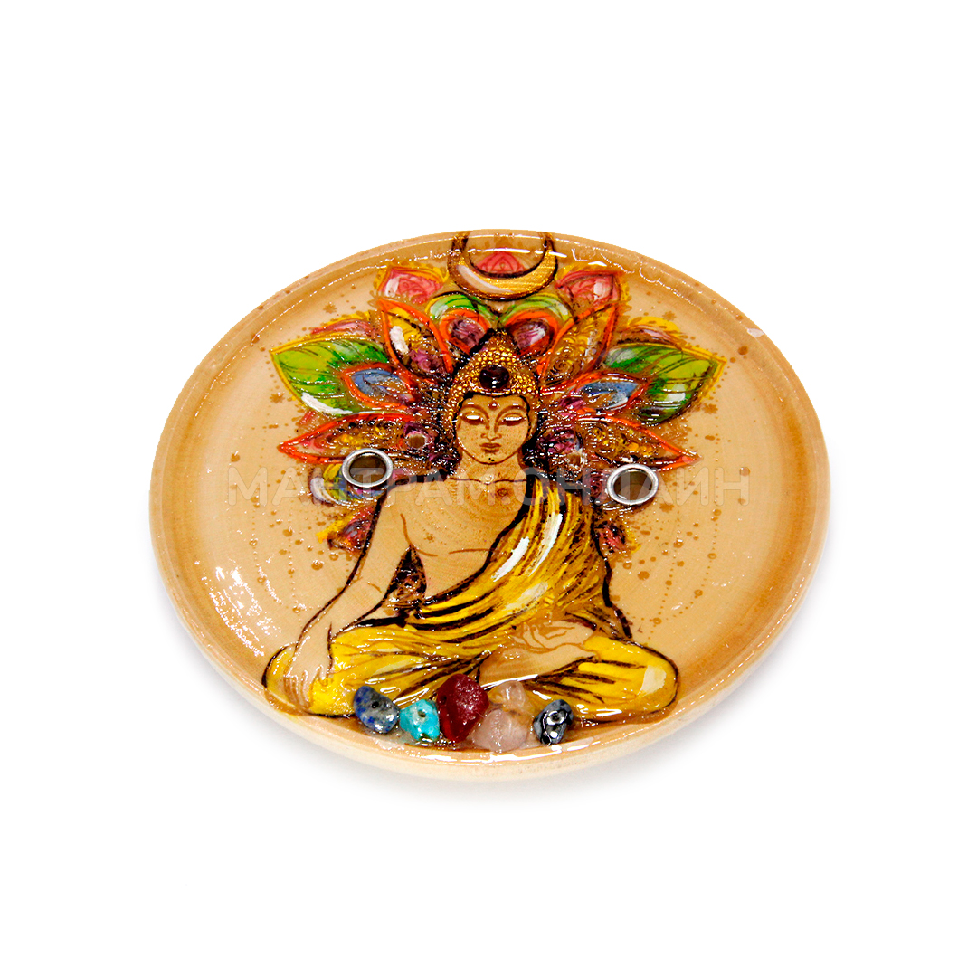 Подставка под благовония из дерева, предназначена для безосновных благовоний, благовоний конусов и ароматических палочек на бамбуковой основе. Подставка очень практична. Палочки надежно крепятся в специальных отверстиях, а сгоревшие их части не разлетаются по комнате и не падают на пол, а осыпаются на подставку. Подставка под благовония украшена изображением Будды, а также лотоса, который привлекает богатство и удачу, чистоту и порядок, дарит свет и гармонию, помогает достигнуть возрождения после упадка и вступить на путь истины.