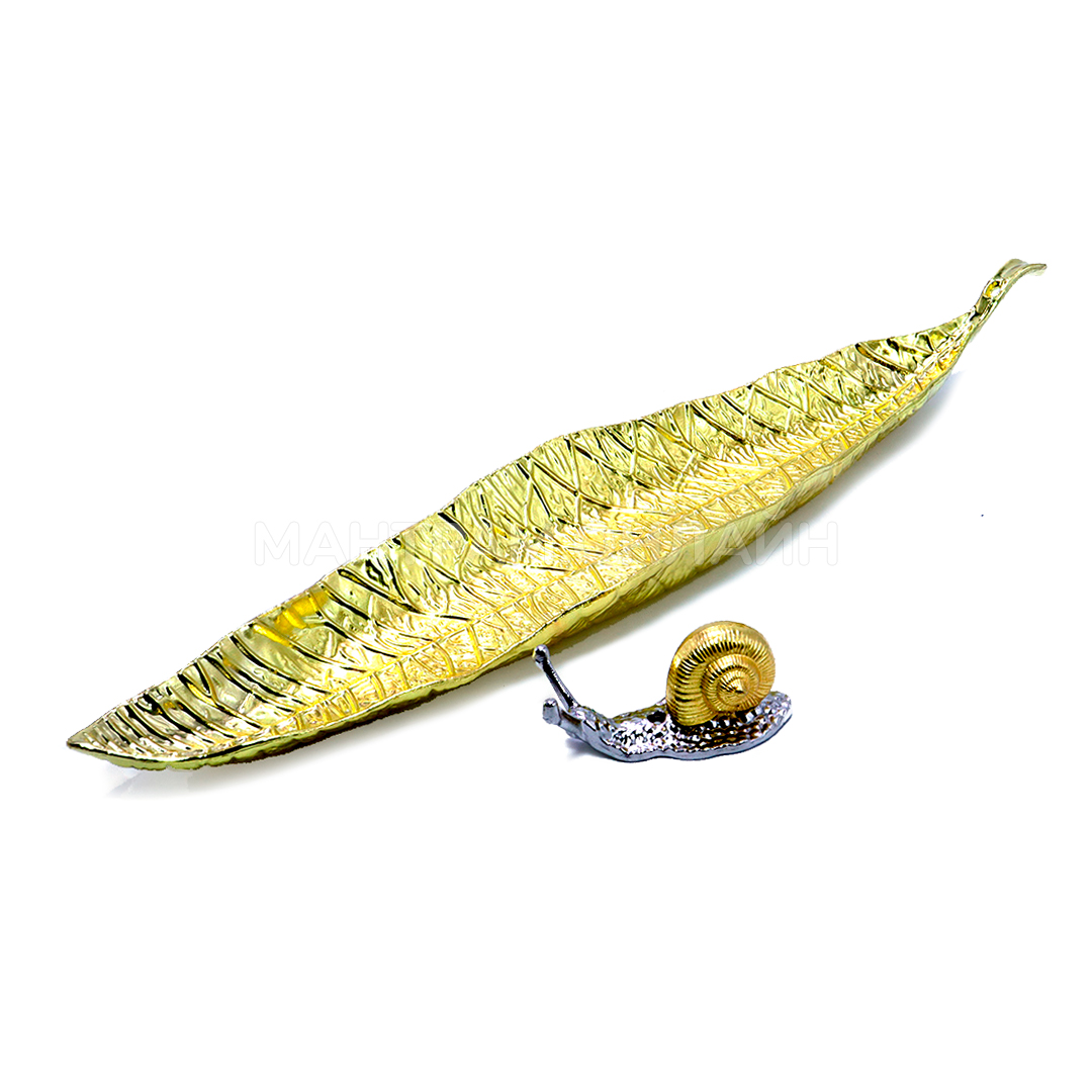 Подставка под благовония Лист с улиткой, материал металл (силумин), цвет золотой. Тарелочка-подставка в виде листочка с улиткой золотого цвета из легкого и прочного металла, отлично подойдет для аромапалочек на бамбуковой основе и благовоний конусов. При сгорании, пепел от благовоний не рассыпается, а аккуратно падает на подставку. После догорания, ее легко вытряхнуть и вымыть.