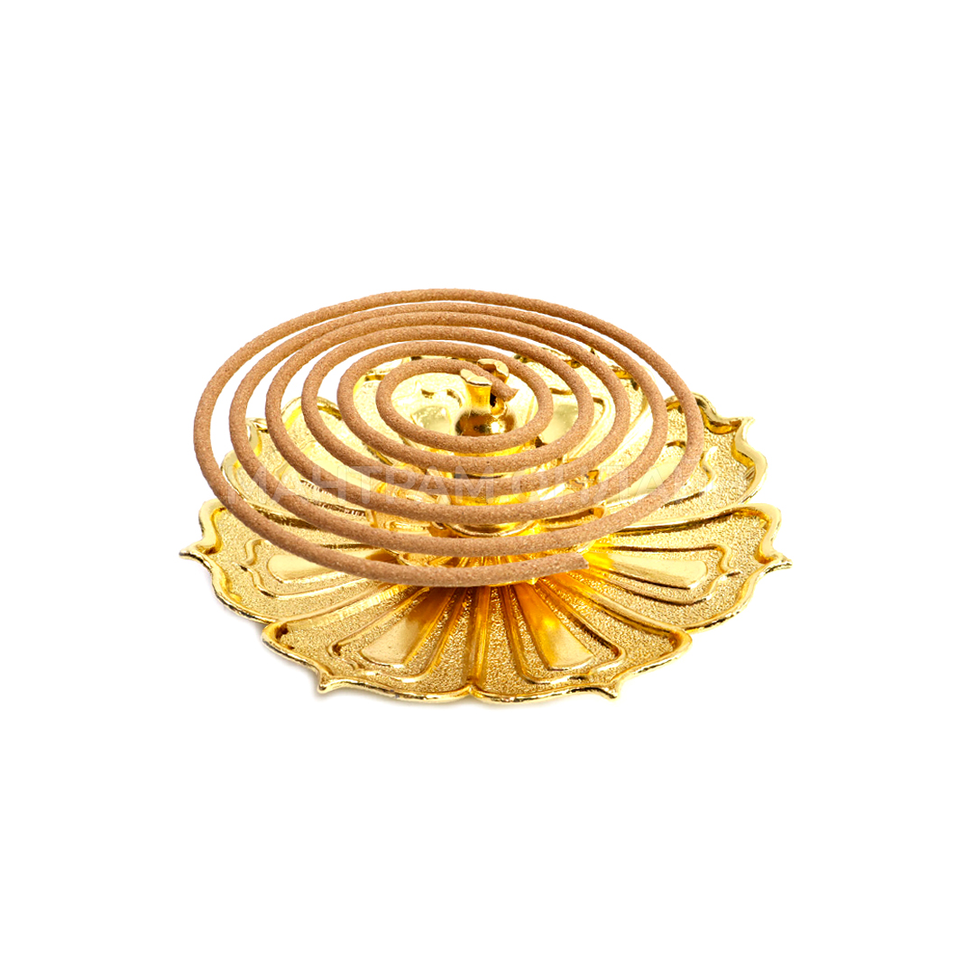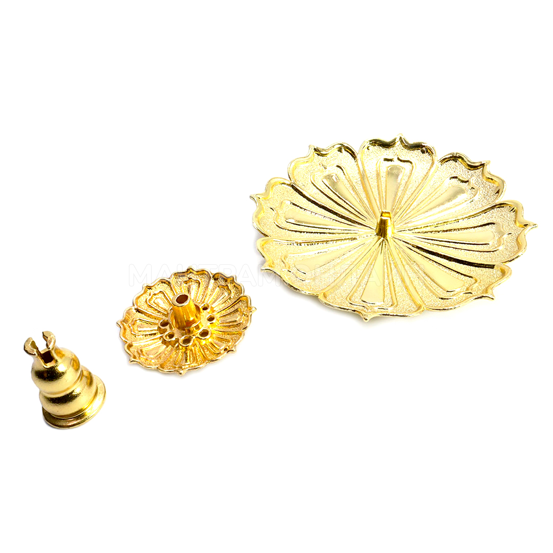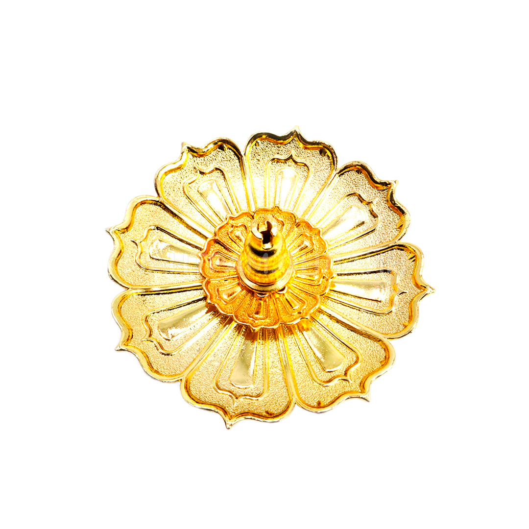 Подставка под благовония Лотос, материал металл (силумин), цвет золотой. Тарелочка-подставка в виде цветка лотоса из легкого и прочного сплава силумин, отлично подойдет для безосновных благовоний разного диаметра, а также для спиральных благовоний и аромапалочек на бамбуковой основе. При сгорании, пепел от благовоний не рассыпается, а аккуратно падает на подставку. После догорания, ее легко вытряхнуть и вымыть.