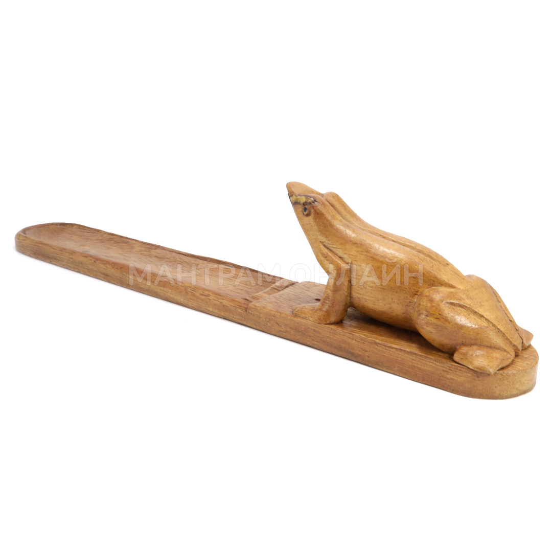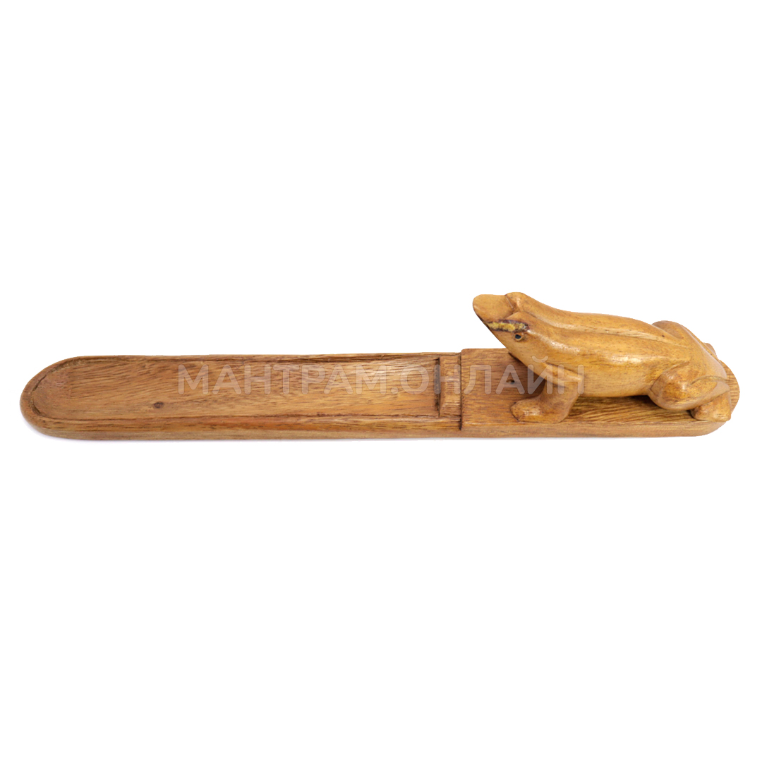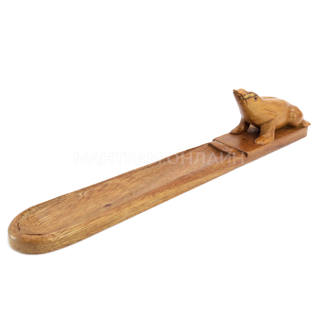 Подставка под благовония для ароматических палочек на бамбуковой основе. Подставка сделана из ценных пород дерева тик, форма - так называемая лыжа - одна из самых популярных среди ценителей благовоний. Выполненная вручную, украшенная фигуркой лягушки, такая подставка очень практична. Рядом с фигуркой имеется отверстие, куда помещается кончик ароматической палочки на бамбуковой основе. Палочка устанавливается под острым углом к поверхности и тлеет, а пепел аккуратно осыпается в ложбинку, подставку очень легко очищать – просто вытряхнуть и вымыть. Подставка для благовоний пропитана специальным составом, не боится воды.