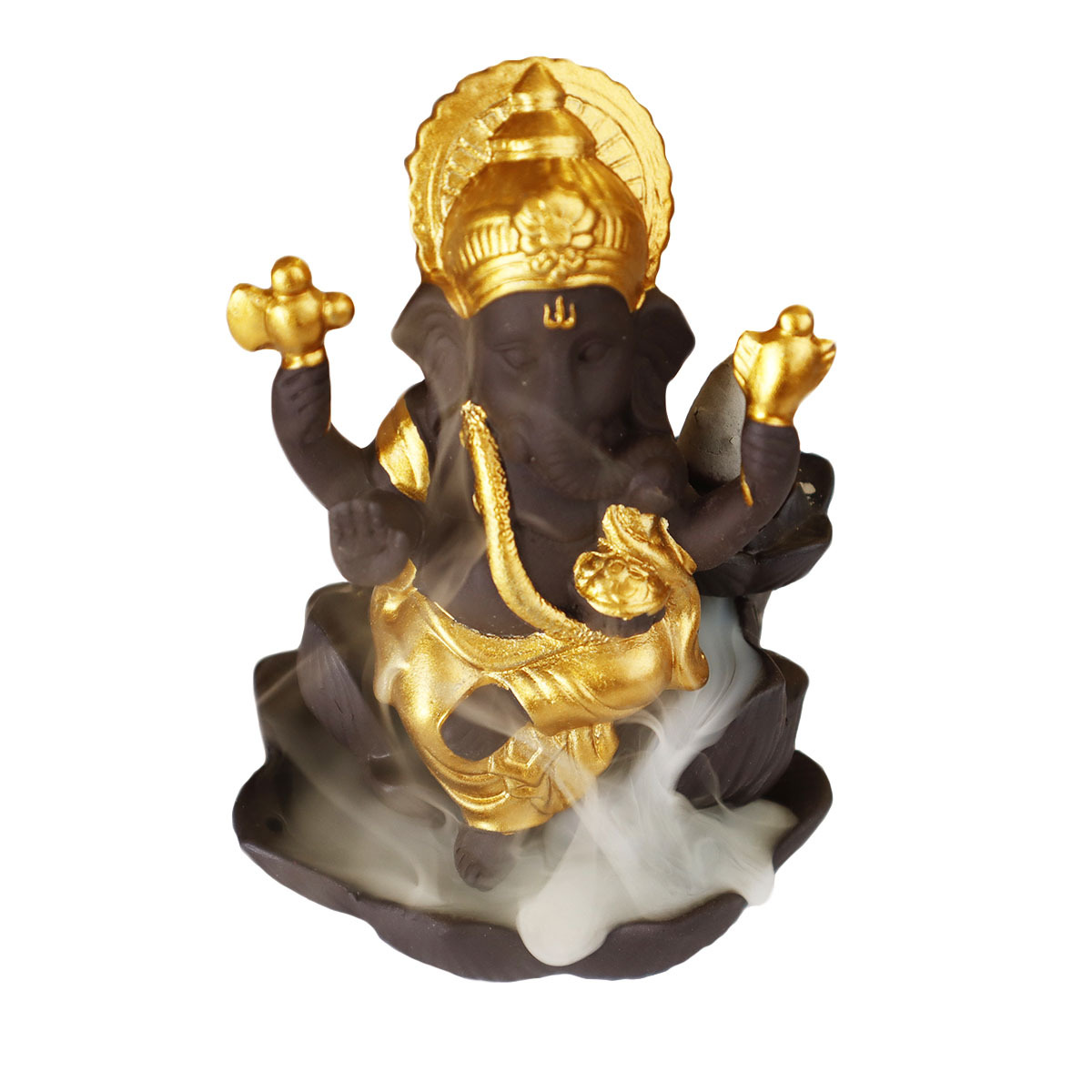 Подставка под стелющиеся благовония Ганеш в лотосе. Подставка под благовония стелющийся дым, материал матовая керамика, цвета: коричневый, золото.