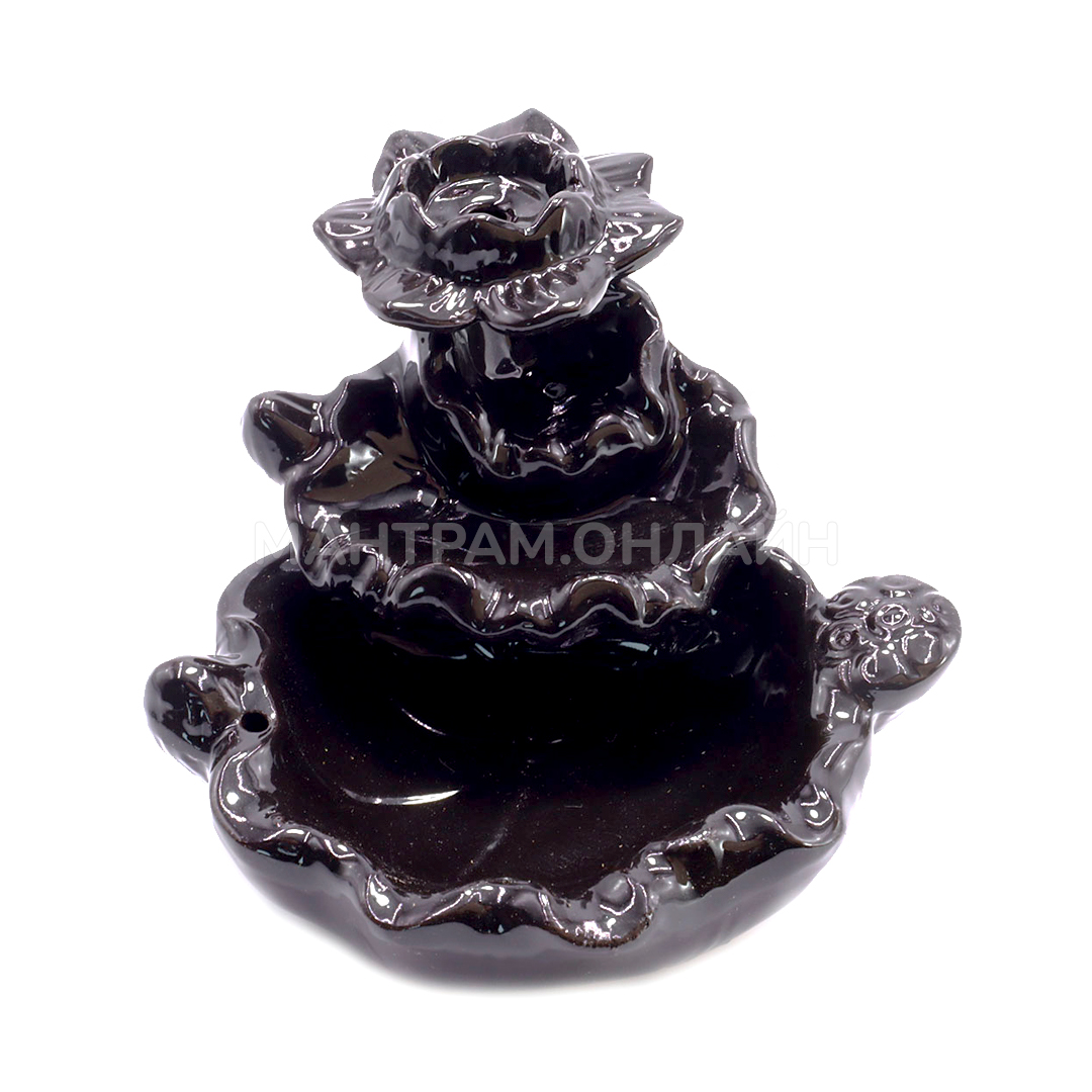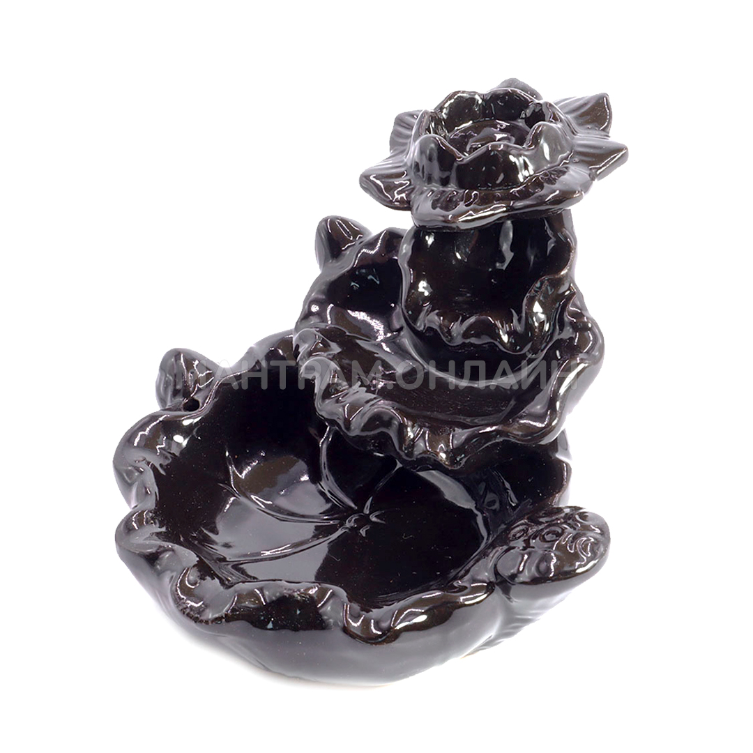 Подставка под благовония стелющийся дым в форме цветка лотоса, материал керамика, цвет черный. Подставка станет прекрасным украшением интерьера. Дым от благовоний не поднимается, как обычно, а красиво опускается вниз. Получается красивый эффект душистого водопада, от которого просто невозможно оторвать взгляд. Ниспадающий тихим водопадом дым выглядит просто потрясающе и контрастирует с блестящей тёмной глазурью.