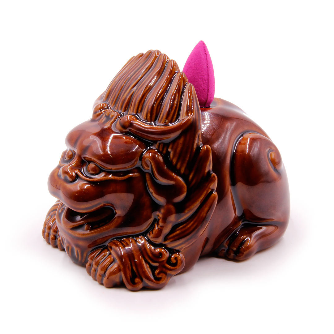 Подставка для стелющихся благовоний в виде снежного льва изготовлена из обливной керамики, станет прекрасным украшением интерьера. Такая подставка создаст в доме красивый эффект душистого водопада, от которого просто невозможно оторвать взгляд. Ниспадающий тихим водопадом дым выглядит просто потрясающе и контрастирует с блестящей тёмной глазурью. Подставка удерживает благовония в ходе горения и защищает поверхность от нагревания. Благовония «стелющийся дым» не терпят резких движений, поэтому зажгите конус, усядьтесь поудобнее и просто полюбуйтесь спокойной красотой Востока и волнами ароматного тумана.