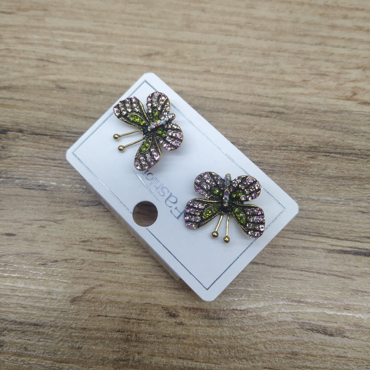 Серьги кольца подвеска Бабочка с усиками стразы цвет салатовый розовый бежевый хамелеон металл золотистый