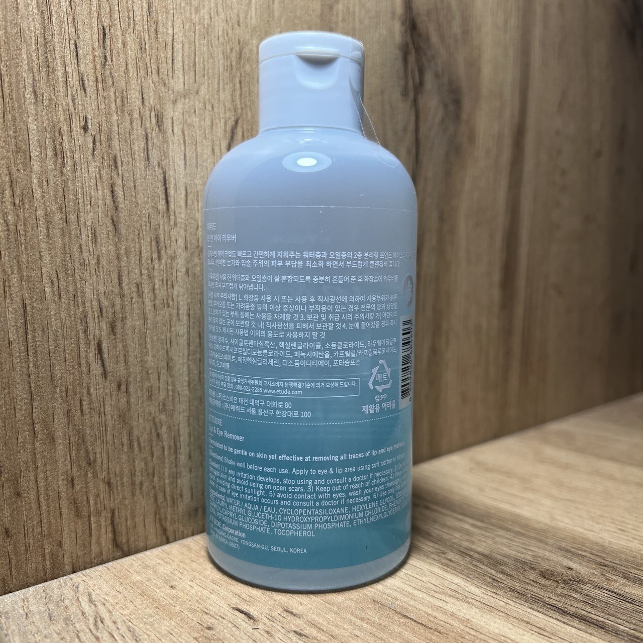 Etude House Lip & Eye Remover – нежное и деликатное, но очень эффективное средство для удаления макияжа с чувствительной кожи губ и глаз с двойной формулой легко и мгновенно растворяет все следы макияжа, без эффекта стянутости и сухости кожи. Не оставляет на коже жирной пленки. Мощный синергетический эффект воды и масла, легко удаляет даже водостойкий макияж, воздействуя на чувствительную область вокруг глаз и губ без какого-либо раздражения.
